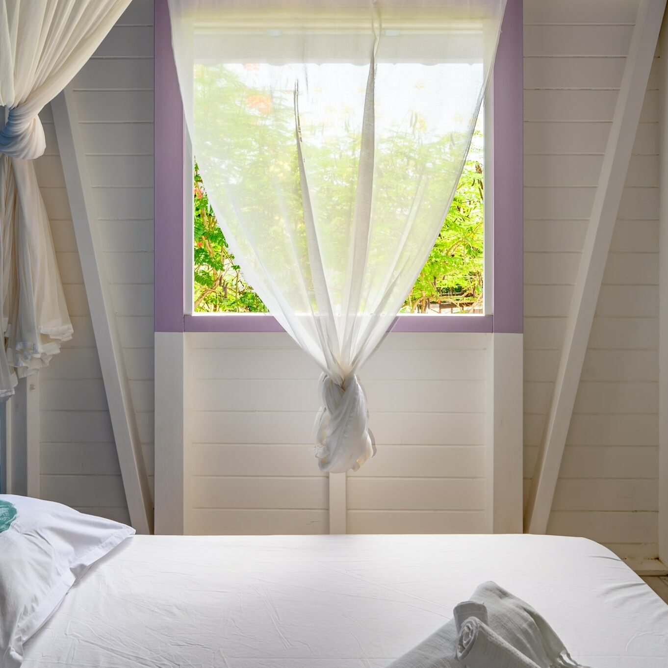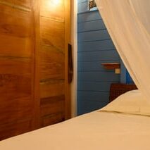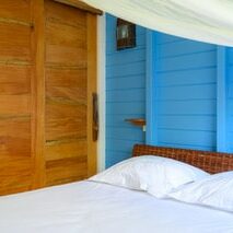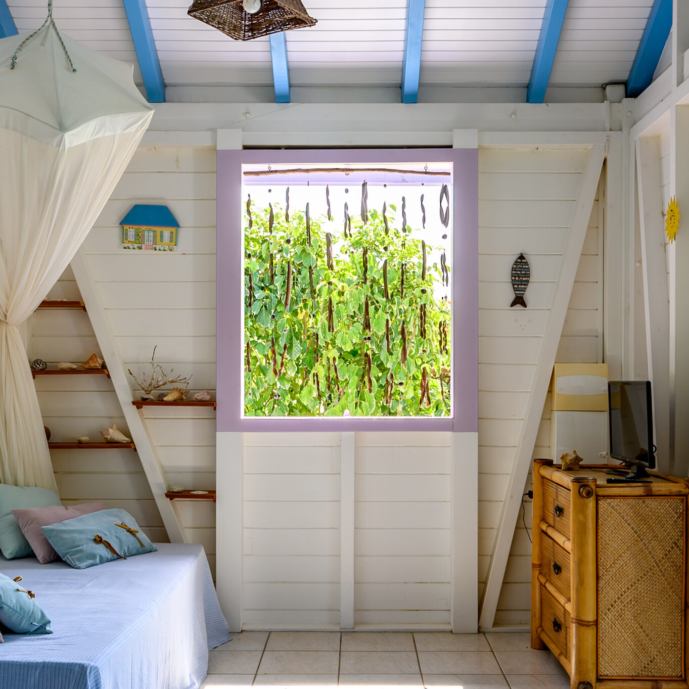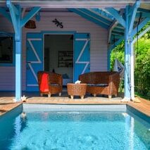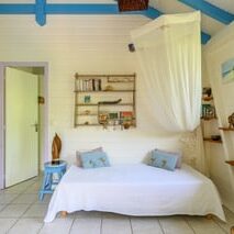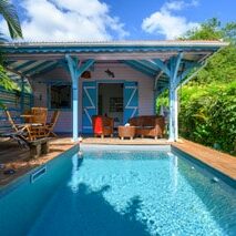 Bungalow de style créole, tout en bois et aux couleurs tropicales, pouvant accueillir un couple et un enfant. D’une superficie de 50 m2, dont 17 m2 de terrasse couverte, elle est très lumineuse et agréablement ventilée.