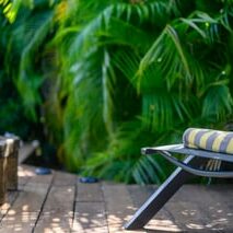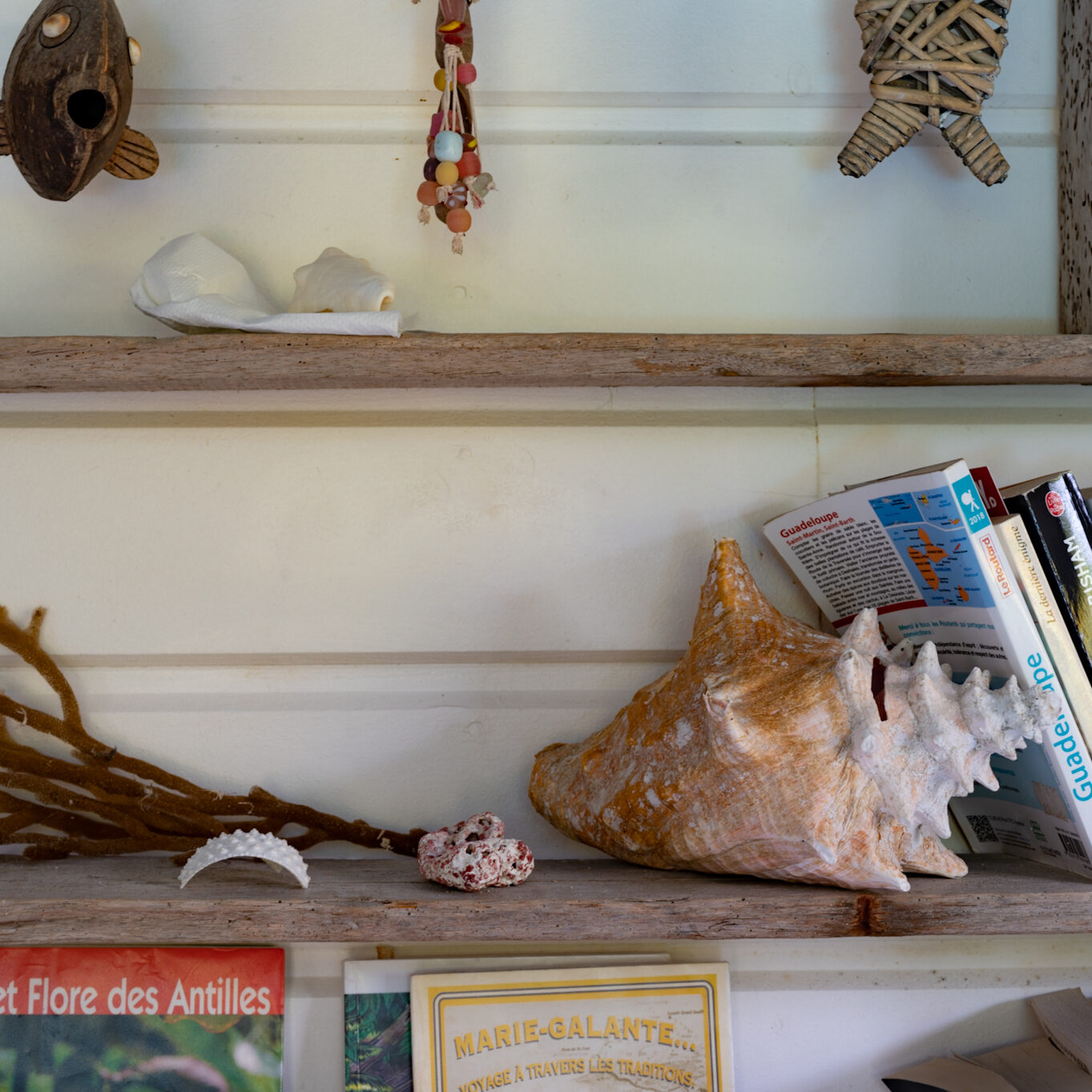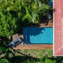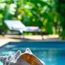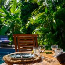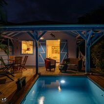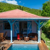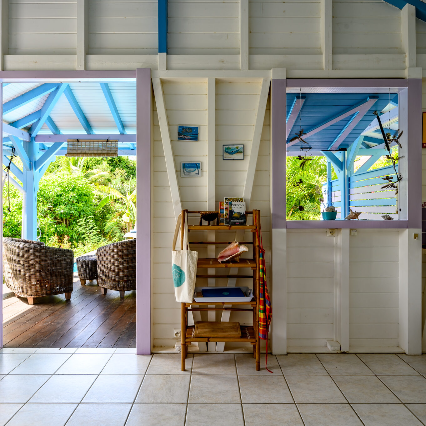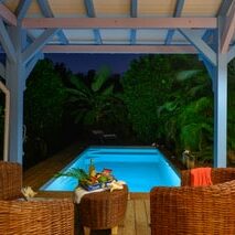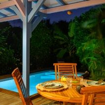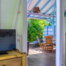 A l’extérieur, une spacieuse terrasse en bois réunit un espace repas et un confortable salon-hamac, donnant sur la piscine privée et le jardin planté de bananiers, papayers, hibiscus, lauriers… Détente et dépaysement garantis !