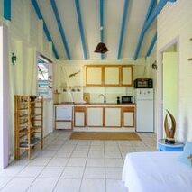 la pièce principale qui réunit le salon-télé avec un lit pour le couchage d’un enfant (moustiquaire et ventilateur) et la cuisine américaine parfaitement équipée : frigo-congélateur ; plaque de cuisson gaz, four électrique ; micro-ondes ; nespresso ; grille-pain ; ainsi que vaisselle et ustensiles en nombre suffisant pour la réalisation de toutes vos recettes !