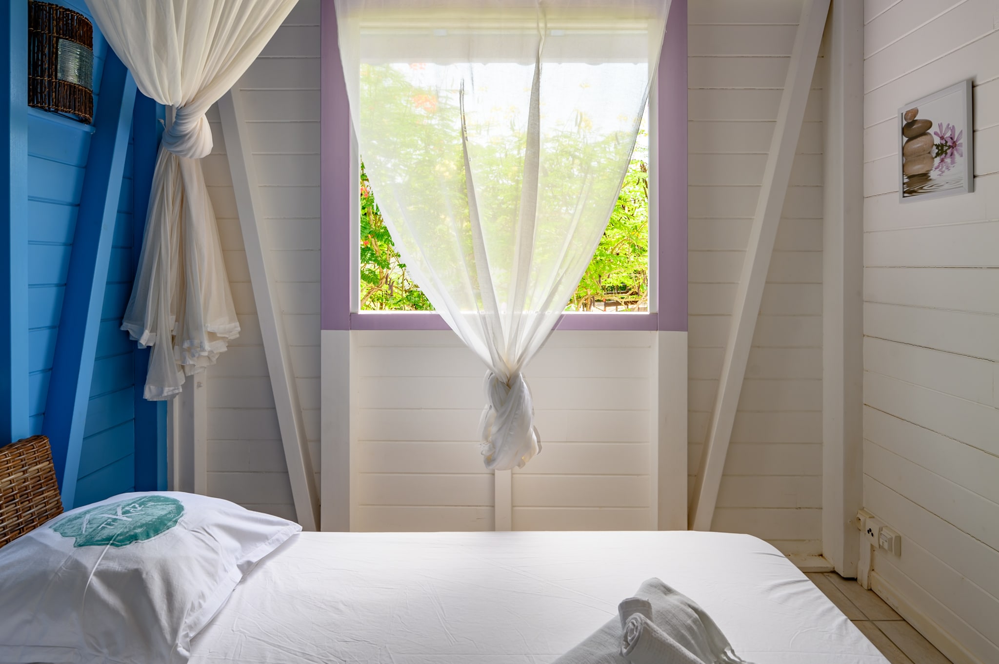 Bungalow de style créole, tout en bois et aux couleurs tropicales, pouvant accueillir un couple et un enfant. D’une superficie de 50 m2, dont 17 m2 de terrasse couverte, elle est très lumineuse et agréablement ventilée.